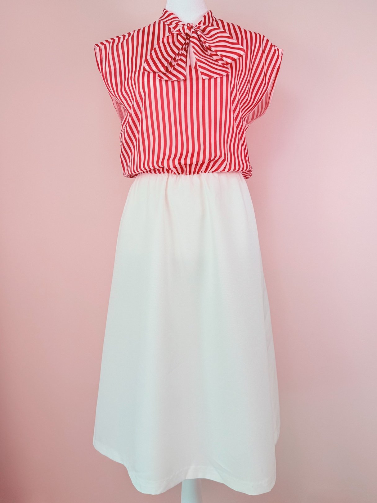 The Candy Stripe Dress features bold red and white vertical stripes across a sleeveless bodice, finished with a v-neckline and a bow tie for a touch of sweetness. The bottom portion is solid white for a clean contrast that gives the look a little extra pop. Lightweight and easy to wear. Would make for a cute party dress!