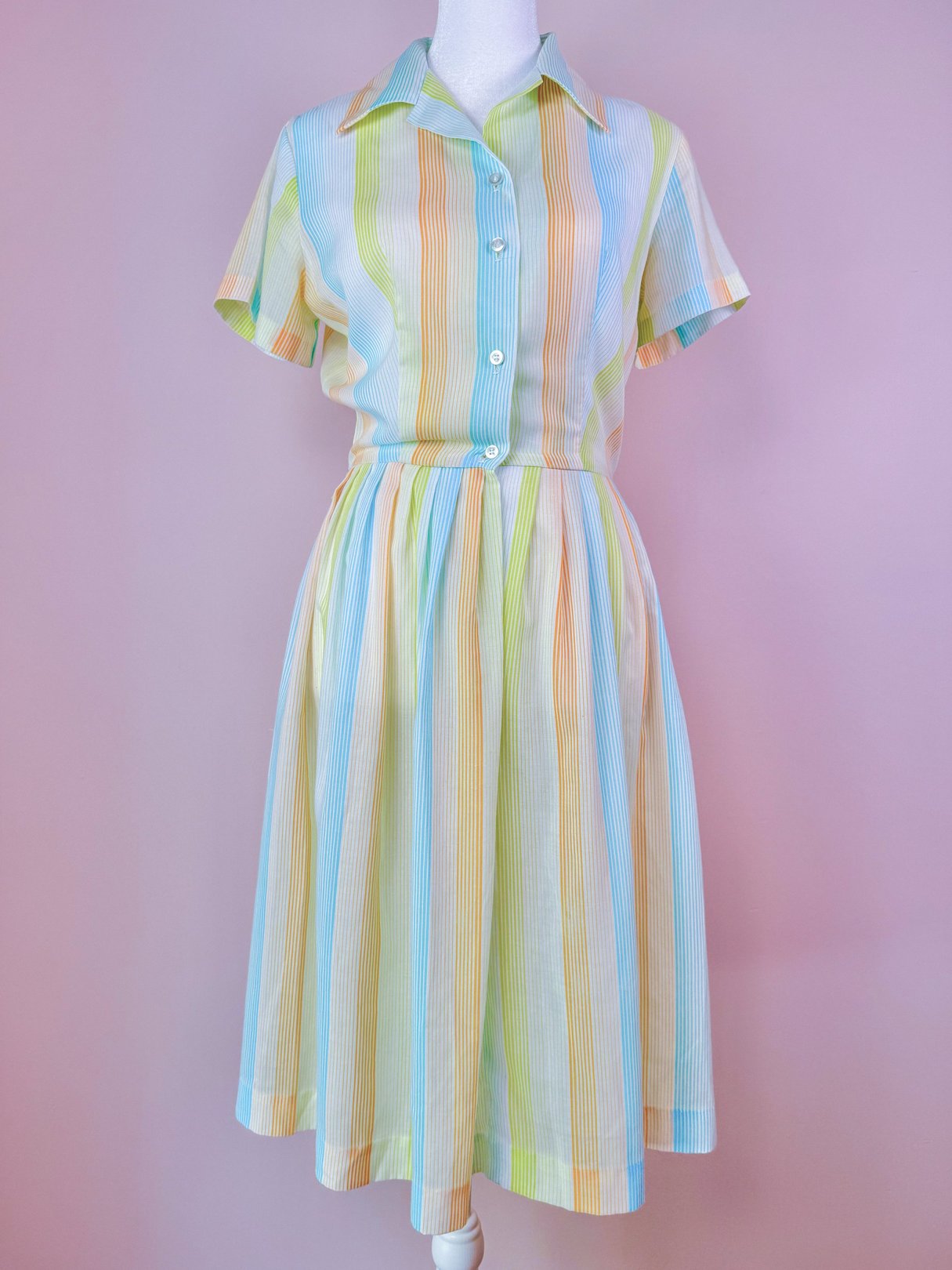 The Citrus Dress features a classic 1950s shirt dress silhouette with short sleeves, a button-down front, and a collared neckline. Vertical gradient stripes in orange, lime, and blue add a playful burst of color against a crisp white backdrop. Made from a lightweight, breathable fabric with a slightly sheer finish. It's perfect over a slip. Easy, effortless, and made for warm weather days.
