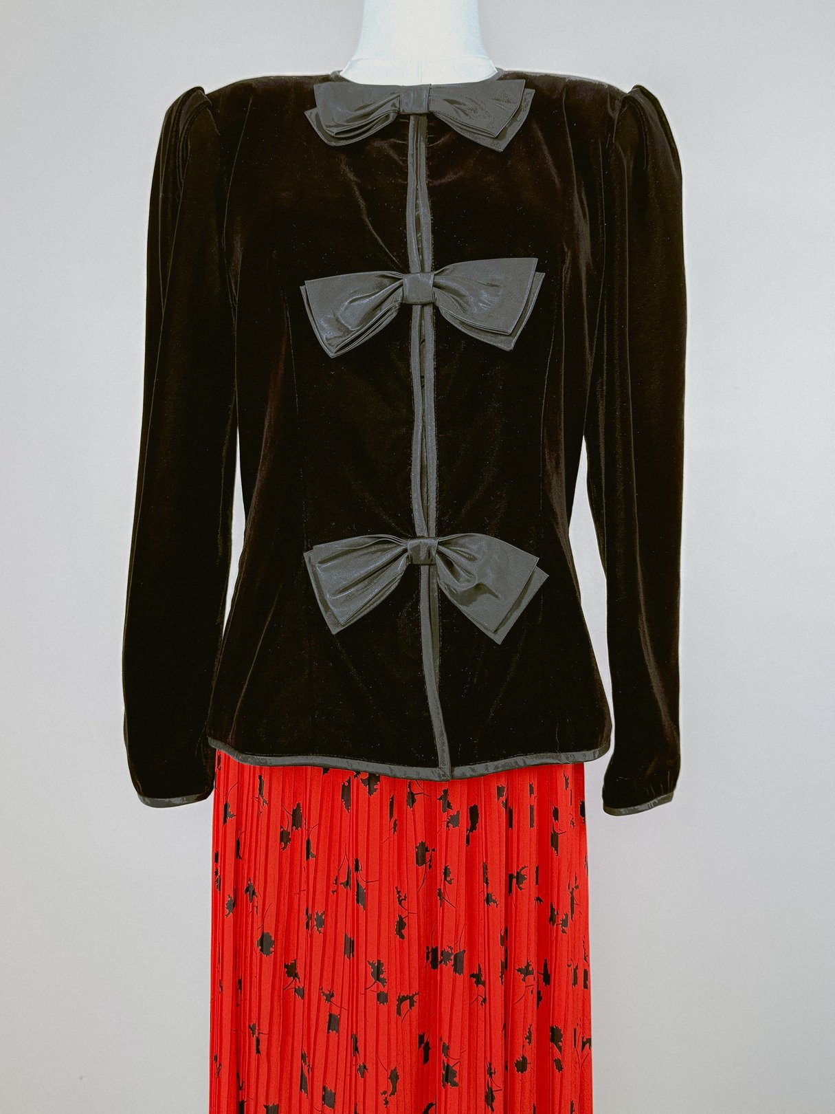 This piece features three statement bows down the front, slight princess shoulders, and a beautifully tailored fit that feels both classic and dramatic. The soft velvet catches the light just so, perfect for evening gatherings or holiday soirées.