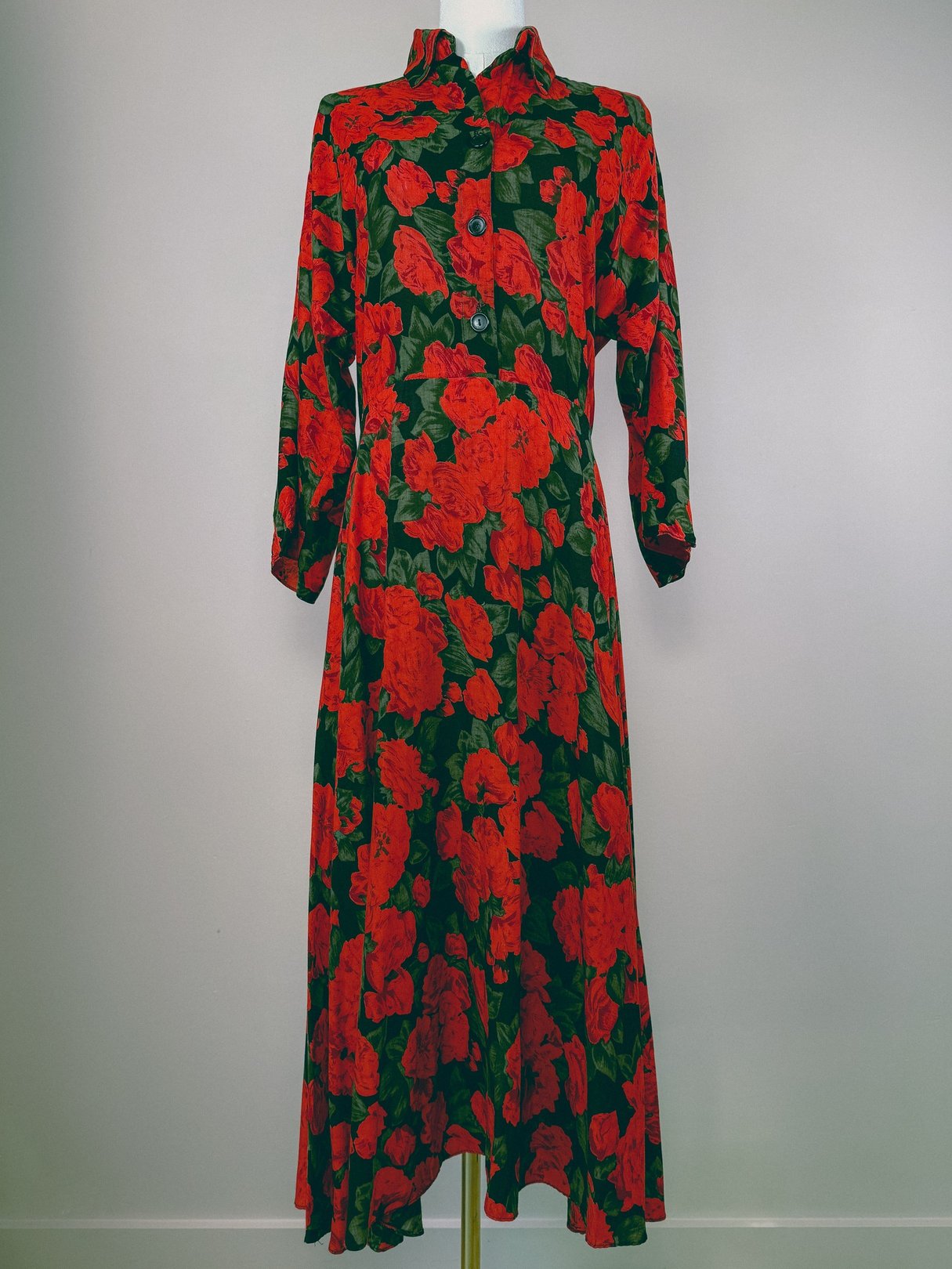 A lively burst of color and charm, this 1990s shirt dress features a vibrant red geranium print against a black backdrop. Designed with a collared neckline, button front bodice, and three-quarter sleeves, it flows into a soft, longer skirt that moves gracefully with every step. Perfect for winter gatherings or spring days alike, it’s an effortlessly elegant ode to garden romance.