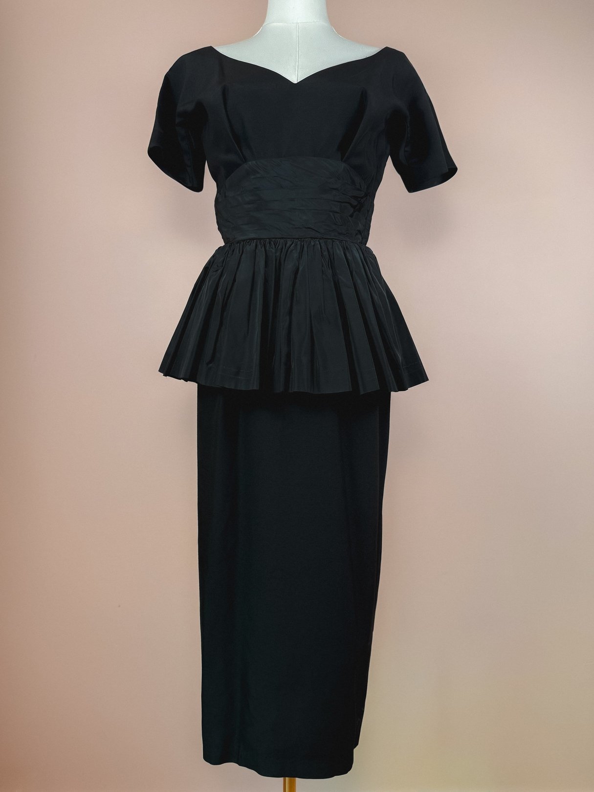 Striking and sophisticated, this 1950s black dress captures the essence of classic Hollywood glamour. A deep V neckline meets a fitted bodice that cinches with a pleated cummerbund-style waist, flowing into a graceful peplum and straight skirt. The result is pure refinement, a silhouette made for champagne toasts and midnight moments.