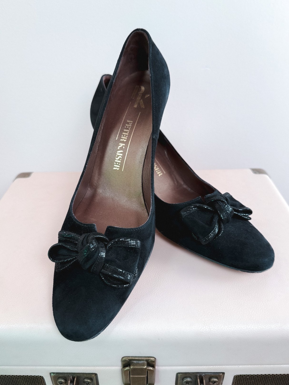 Classic and endlessly versatile, these Peter Kaiser heels bring a touch of modern European luxury to any look. Crafted in soft black suede with a rounded toe and finished with a knotted bow detail, they strike the perfect balance of polish and femininity. The comfortable heel height makes them easy to wear from day to night, whether styled with tailored trousers or your favorite vintage dress. A true wardrobe staple with timeless appeal.