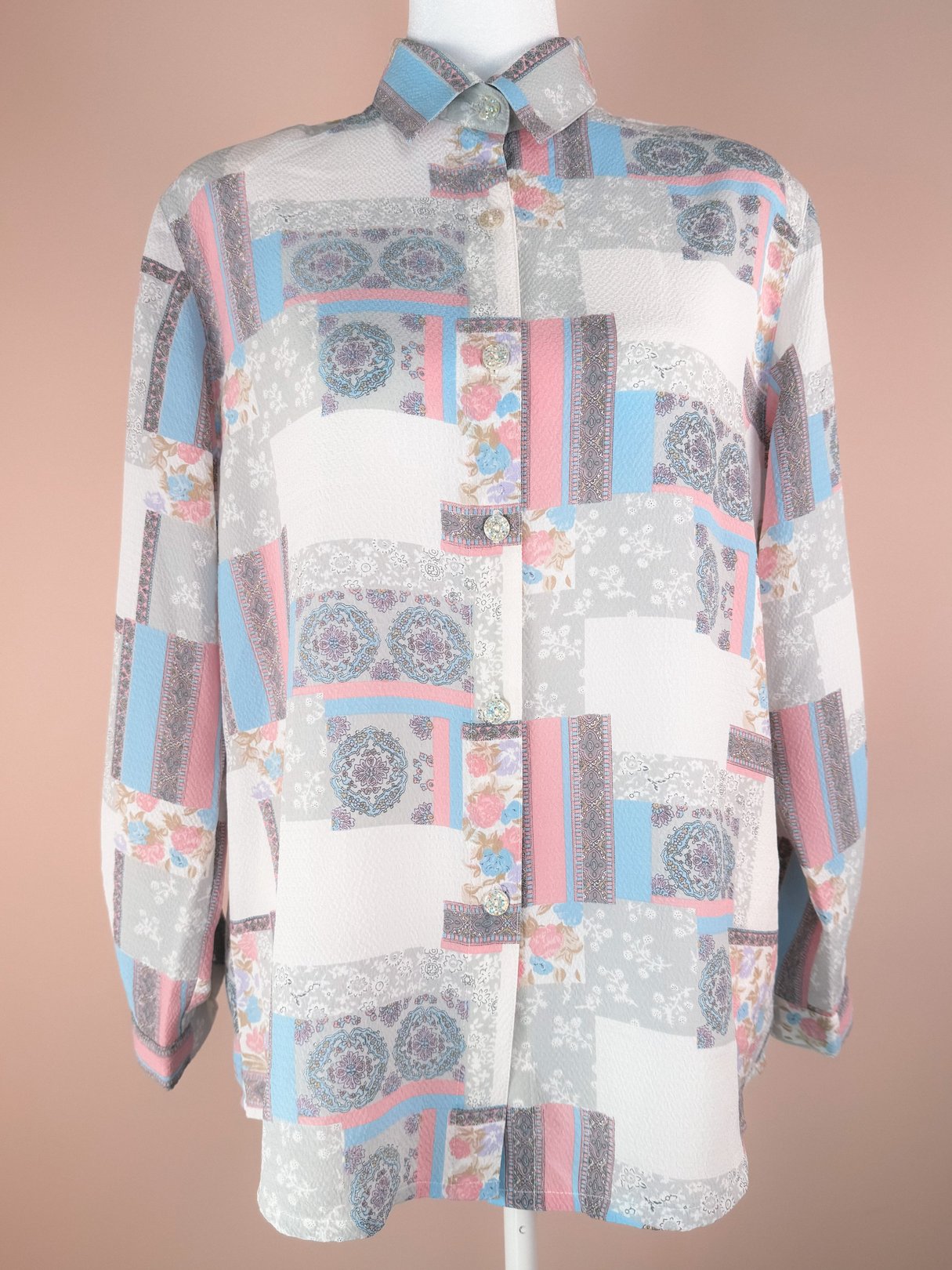 Celebrate in color with this soft, lightweight button-down blouse from the 1980s. Crafted in a polyester blend, it features a patchwork print that mingles paisley medallions, floral borders, and subtle florals in pastel pink, powder blue, lavender, and cream. What I love most is the glittery buttons! The collared neckline, long sleeves, and shoulder pads keep it classic, while the mix of patterns brings a playful, artful twist. Perfect tucked into high-waisted trousers for a chic, party-ready look or worn loose for easy weekend style.