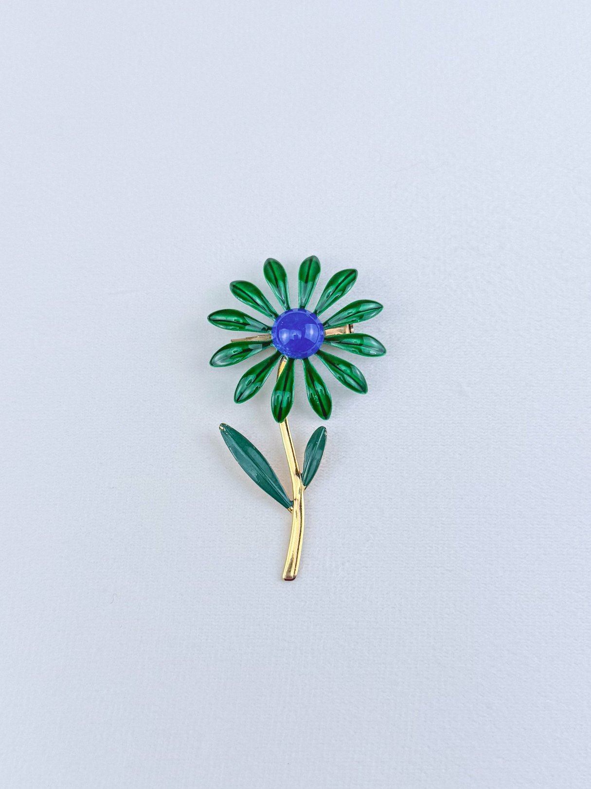 This playful 1960s brooch features a bold, single floral design in gold-tone metal with multicolor enamel detailing. Its sculptural shape and petal-like curves give the feeling of a flower caught mid-twirl—soft, stylized, and full of movement.
