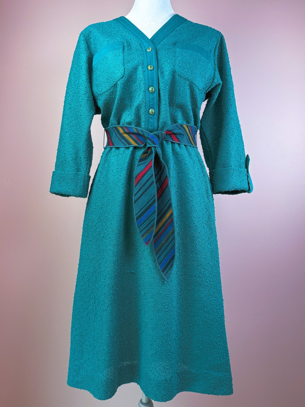 This beautiful late 1970s Leslie Fay dress dances between structure and softness. Its richly textured teal green fabric offers a cozy drape with visual depth—soft like terry cloth but sleeker, more refined. The slightly dolman sleeves, V-neckline, and two front pockets lend it easy sophistication, while the striped tie belt adds a cheerful burst of red, yellow, and accents.