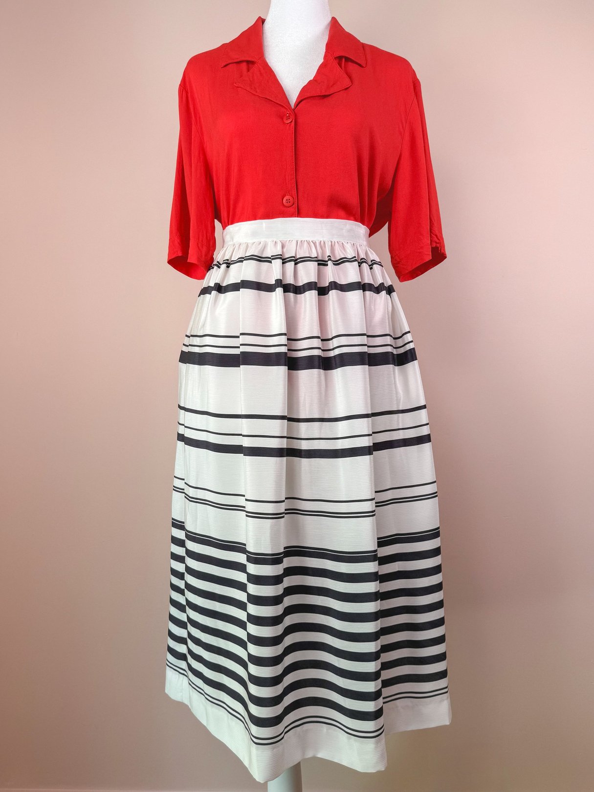 Understated, timeless, and ready for a seaside escape. The Tide Line Skirt features crisp black horizontal lines across a soft white background, with a silky feel that drapes beautifully. Its A-line silhouette falls just below the knee, sitting slightly above the waist for a flattering fit. Perfect for tucking in your favorite summer blouse. Think Audrey Hepburn on a coastal getaway, paired with ballet flats and a straw hat.